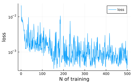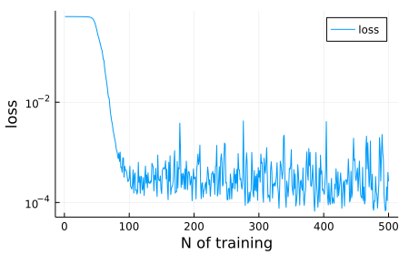 Flux.update! よりもデータセットを引数にできる Flux.train! で学習をかけることにする。 Training · Flux の "Custom Training loops" によると、Flux.train! は Flux.update! を各データに対してかけているのと同じらしい。 よって、 loss としては方程式の sampling points に渡っての mean squared error を設定する。