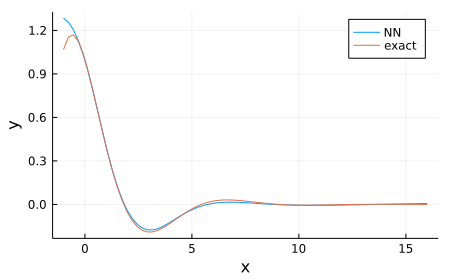 まず、自明な問題として次を考える。 $$ y(x) = \sin(x) $$ この $y(x)$ を NN で近似する。コードは次のようになる。 まず Flux で中間層2、ニューロン数32の NN モデルを構築する。