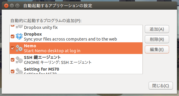 上記のppaからnemoをインストールすると自動起動セッション一覧にこの項目が追加されているはず。